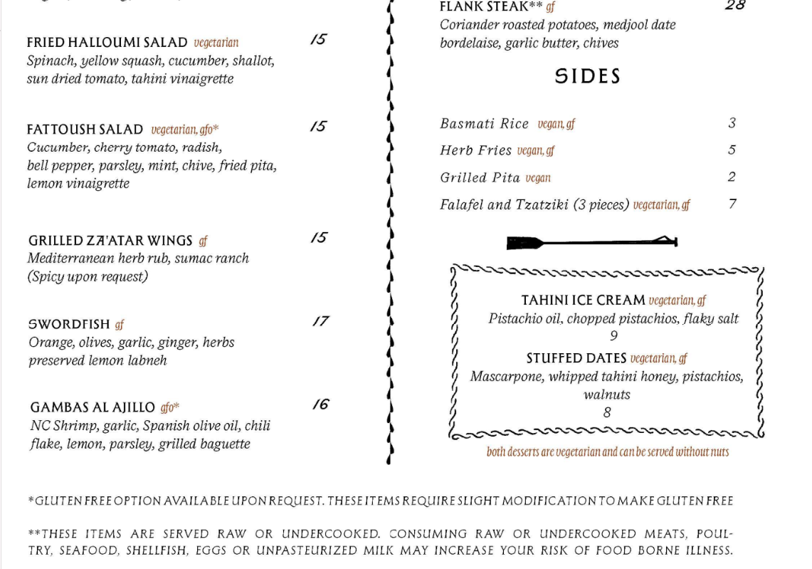 Dinner menu, Tuesday- Sunday, 4pm- 10pm